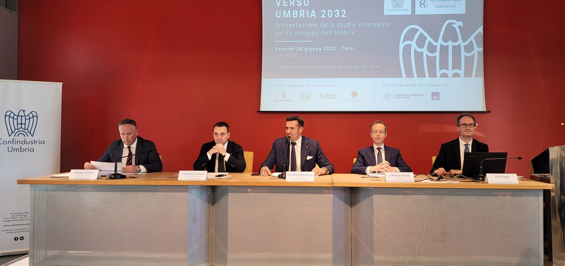 PERUGIA – Presentata nelle sedi di Perugia e Terni di Confindustria Umbria l’anteprima dei risultati di “Umbria 2032”, studio strategico per lo sviluppo dell’Umbria promosso da Confindustria Umbria, affidato a The European House Ambrosetti e realizzato con il contributo di Regione Umbria, Sviluppumbria, Fondazione Perugia e Fondazione Cassa di Risparmio di Terni e Narni.