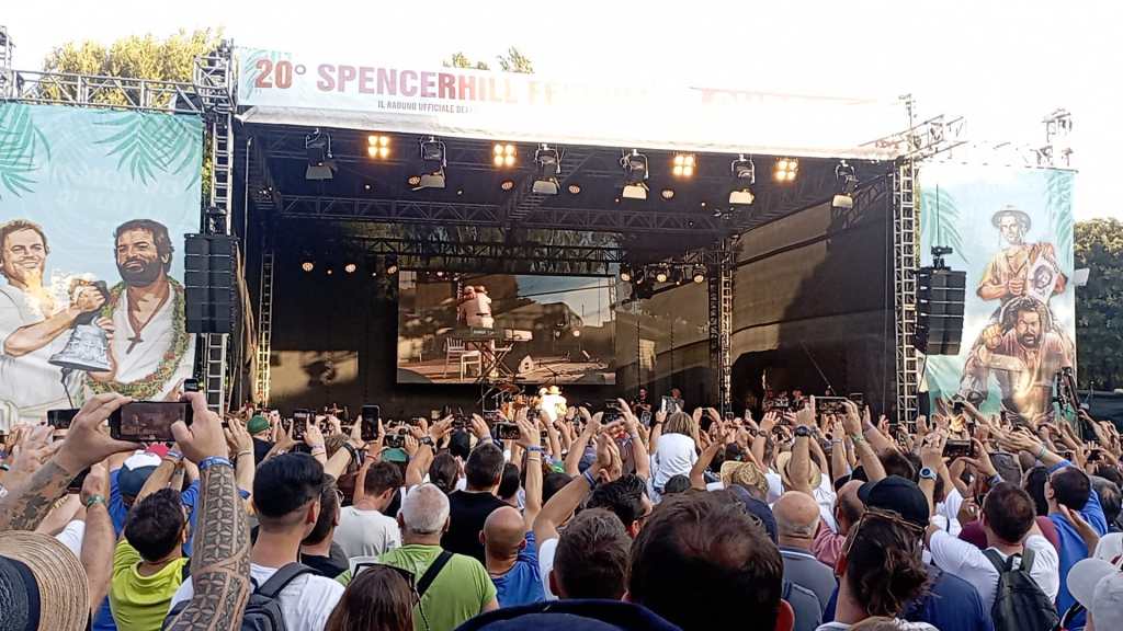 Introdotto dalle note della colonna sonora di “Trinità” interpretate dalla voce storica della canzone, Annibale Giannarelli, appena salito sul palco, Hill è stato accolto dal boato dei migliaia di fan presenti in piazza 40 Martiri e si è rivolto a loro parlando sia in italiano che in tedesco, lingua che conosce perfettamente visti i numerosi anni passati in Germania (nazione di cui era originaria la madre Hildegard Thieme), prima in giovane età dopo aver lasciato Amelia (città natale del padre Girolamo Girotti) e poi durante i primi anni da attore di western prima di entrare nella leggenda.