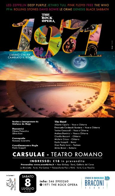 TERNI- Dopo aver portato con successo lo spettacolo all’attenzione degli appassionati di Terni e Perugia, faranno rivivere nel magico scenario del teatro romano di Carsulae lo spettacolo che ripercorre la storia del rock. Nove musicisti che si sono ritrovati insieme grazie alla loro passione per il rock classico. Da qui nasce il progetto “1971 The rock opera” da un’idea di Paolo Scappiti coordinatore e regista, scritto e interpretato da Stefano de Majo, uno spettacolo di musica e teatro che ripercorre il 1971 anno d’oro per l’uscita di molte canzoni che sono diventate un pezzo di storia della musica di sempre. L’anno della svolta in cui il rock diventa mito e leggenda, l’anno del grande suono delle chitarre Fender e dei castelli di Marshall, degli Hammond mastodontici e dei moog spaziali. Lo spettacolo si sviluppa oltre alla musica con video e testi e crea un’intensa narrazione sui più grandi protagonisti del genere: dai Led Zeppelin ai Genesis, dagli Who ai Jetro Tull, dai Black Sabbath ai Deep purple, i Pink Floyd e tanti altri. Sabato 8 luglio lo spettacolo riserverà alcune bellissime sorprese che porterà il progetto oltre al 1971 esplorando nuovi orizzonti temporali. The Band: Alberto Cipolla – Voce e chitarra, Emanuele Cordeschi – Voce e chitarra, Tonino Cuzzucoli – Voce e chitarra, Andrea Dominici – Voce e chitarra, Claudio Baccani – Chitarra, Michele Cricco – Chitarra, Paolo Scappiti – Basso, Gian Paolo Ionni – Tastiere e Mirko Brizzi – Batteria. L’attore interprete sarà Stefano de Majo, ballerine Cjiara Pistecchia e Silvia Nori. Le coreografie sono a cura di Romana Sciarretta e il coordinatore/regia è Paolo Scappiti.