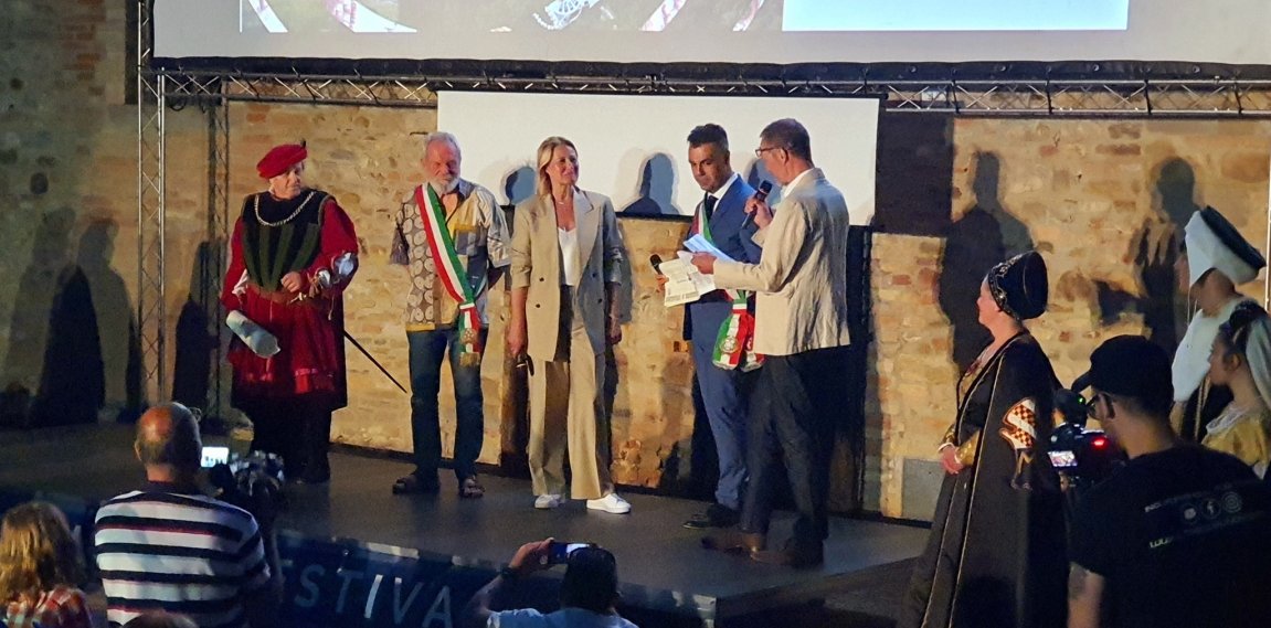 MONTONE (Perugia) – L’Umbria Film Festival chiude la ventisettesima edizione con un evento d’accezione. Sono state infatti consegnate all’attrice danese Trine Dyrholm le chiavi della città di Montone. Sul palco, insieme all’interprete vincitrice dell’Orso d’argento al Festival del Cinema di Berlino del 2016 con il film “La comune” di Thomas Vinterberg, erano presenti il sindaco di Mirco Rinaldi e il presidente onorario della kermesse cinematografica montonese, il regista Terry Gilliam.