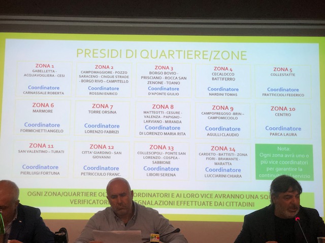 In sostanza la città viene divisa in 14 zone, ogni zona avrà un gruppo di volontari che presidieranno e che saranno guidati da un coordinatore e un vicecoordinatore più un verificatore per le istanze e le problematiche dei residenti. Tramite lo Sportello ‘AiutAMO Terni’ i cittadini potranno segnalare le loro questioni nello spazio ‘Centomila occhi’ e sulla base di 9 aree tematiche corrispondenti alle deleghe degli assessori comunali. Il cittadino può fare la segnalazione compilando il form e può allegare foto e video, la segnalazione arriva al coordinatore di zona che con il suo gruppo verifica per poi inoltrarle in sede di AP che poi le inoltrerà all’assessore di riferimento.Strutturato anche il partito con i dipartimenti tematici divisi sulla base degli assessorati. Bandecchi: «Faremo lo stesso anche con Perugia e presto comunicheremo il candidato a sindaco di AP».