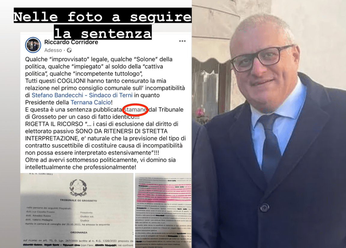 Dal documento che Umbria7 propone ai suoi lettori qui di seguito – e lo fa per puro spirito di collaborazione e per la stima che ha di Corridore, non certo un tipo avvezzo a sparare corbellerie – si evince che «oggi» è l’ottobre 2022. Bandecchi non aveva ancora umettato i tifosi dissidenti e non era candidato sindaco. L’ordinanza è stata trasmessa alla Corte d’appello in data 14 dicembre 2022. E quindi, avverso l’ordinanza, c’è un regolare ricorso pendente.