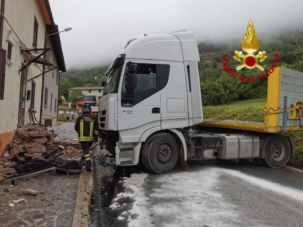 SCHEGGIA E PASCELUPO (Perugia) – È avvenuto alle 9.30 della mattina di mercoledì 30 agosto un incidente stradale località Ferba di Scheggia durante cui, dopo la fuoriuscita di gasolio dal serbatoio, un camion è andato a sbattere contro la pensilina d’ingresso di un’abitazione a bordo strada.