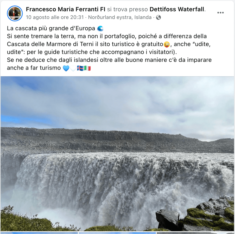TERNI – Non che Francesco Maria Ferranti (FI) sia andato in Islanda per testimoniare la gratuità della cascata con la maggior portata d’acqua d’Europa, la Dettifoss waterfall. Comunque un messaggio lo pubblica: «Qui si sente tremare la terra, ma non il portafoglio, poiché a differenza della Cascata delle Marmore di Terni, il sito turistico e gratuito, anche “udite, udite”, per le guide turistiche che accompagnano i visitatori».