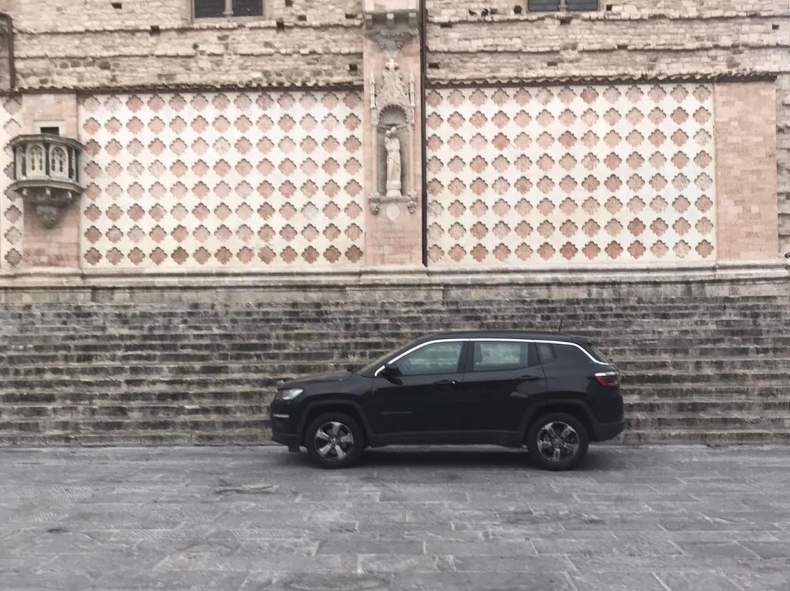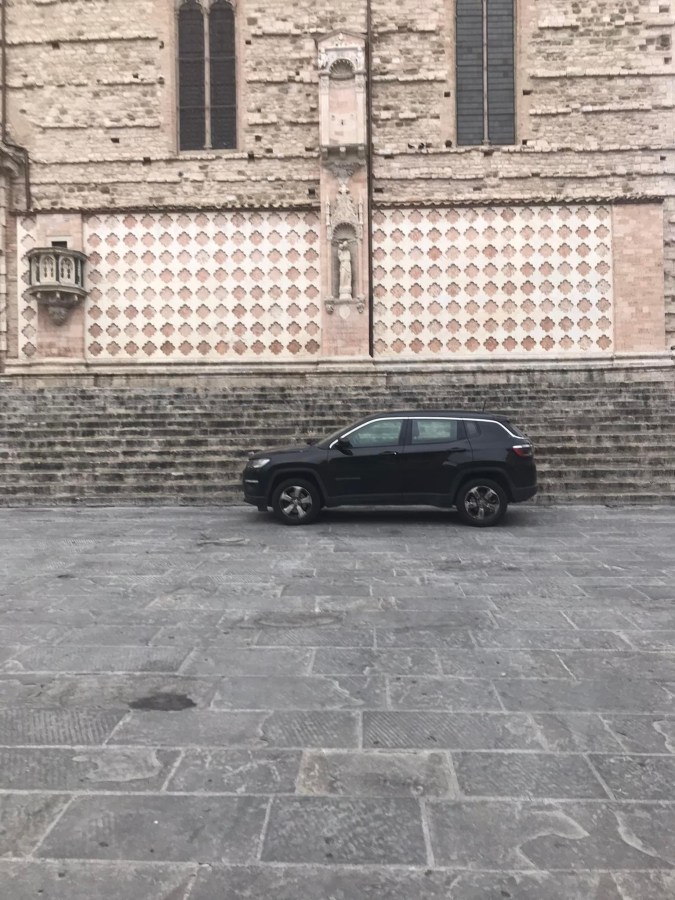 Come quanto accaduto nella mattinata di venerdì, ovvero qualche ora prima che piazza IV Novembre si riempisse di curiosi e turisti per ammirare lo spettacolare messaggio delle frecce tricolore. Davanti alla cattedrale di San Lorenzo, infatti, qualcuno ha parcheggiato la propria macchina senza alcuna preoccupazione.