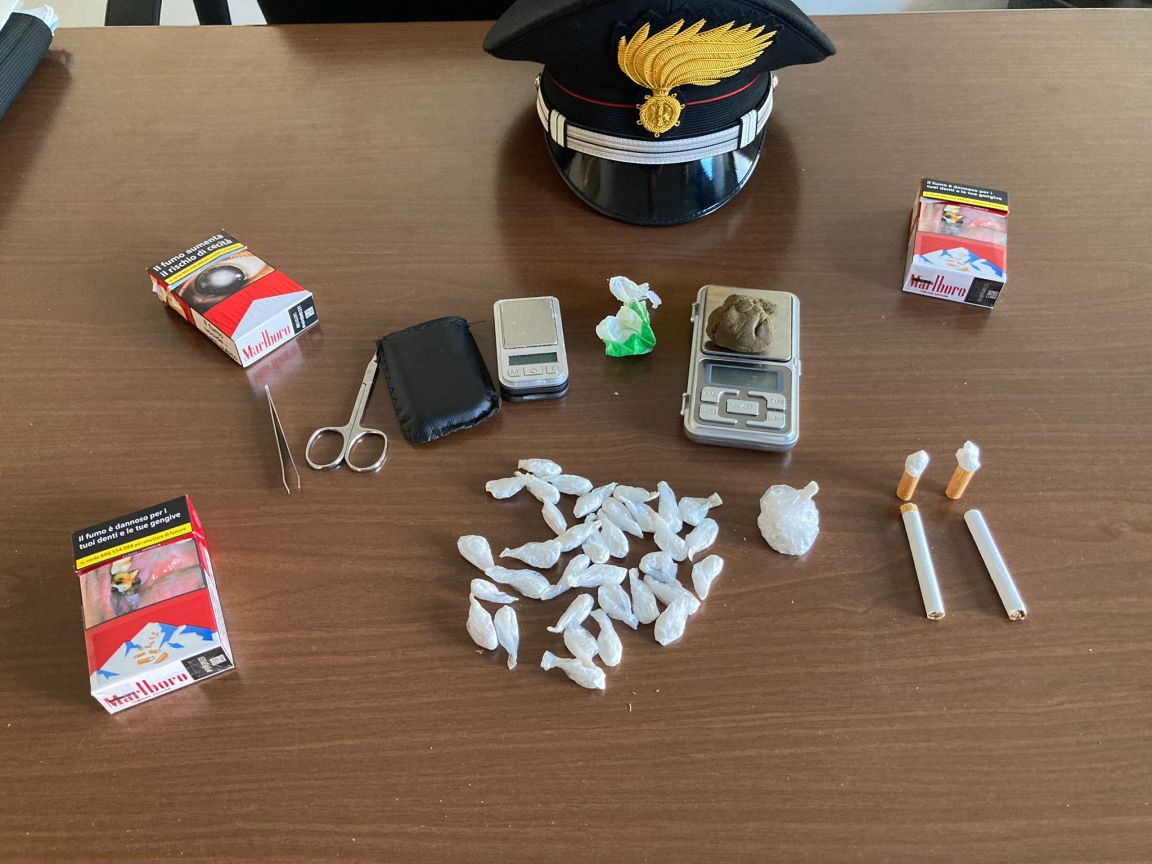 Dopo un’attenta perquisizione personale, veicolare e domiciliare, è emerso un impressionante quantitativo di materiale illecito. Al termine delle operazioni sono stati infatti sequestrati: 17 grammi lordi di sostanza stupefacente di tipo hashish; 36 dosi pronte per un totale di 17 grammi lordi di sostanza stupefacente di tipo “cocaina”, abilmente nascosti all’interno di sigarette con parte del filtro asportato per occultare la droga; 2 bilancini di precisione; materiali per il confezionamento delle dosi; una somma di 150 euro, suddivisa in tre banconote da 50 euro.