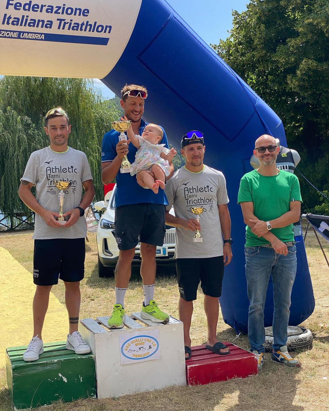 Per Capocci e Antonucci una frazione di nuoto in difesa e di resistenza, prima di scatenarsi nelle frazioni in bici (Capocci quarto tempo assoluto e Antonucci quinto) e di corsa (Capocci ancora quarto tempo assoluto e Antonucci settimo). Un’emozione speciale quella vissuta al traguardo da Luigi Antonucci: «Per me è stata la prima finish line con la mia famiglia e soprattutto la piccola Violante arrivata da 5 mesi ad incitarmi ed attendermi. Una bellissima emozione». Marco Capocci ha voluto invece ricordare Fabrizio Rivelli, scomparso due anni fa: «Non amo gli sprint e non mi alleno per le distanze corte, ma era doveroso partecipare alla gara di casa in ricordo di un caro amico e compagno di squadra – ha scritto Capocci sul suo profilo Facebook – quando metti il pettorale i se e i ma vanno lasciati a casa e devi dare il massimo anche se parti da sfavorito. Gara superlativa a prescindere dal risultato di cui sono pienamente soddisfatto: 9° Assoluto, 2° di categoria S3, partendo dalla terza batteria e per 20 secondi perdo il titolo umbro. Oltre a questo credo che abbiamo dimostrato, come sempre, cosa significhi essere squadra. E’ stato fantastico e molto adrenalinico correre con i miei compagni, incoraggiandoci lungo il percorso. È finalmente tornata la fame di triathlon che mancava da tempo, fame che spero mi sarà utile per preparare il finale di stagione a cui tengo particolarmente. E come diceva un caro amico: ‘è proprio una croce nasce belli»