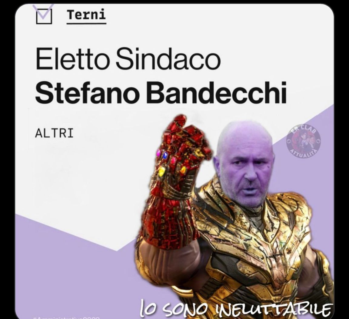 TERNI – Il più potente personaggio dei film della Marvel. Colui che con uno schiocco delle dita può distruggere il mondo. Uccidendo chiunque non sia di suo gradimento. Un personaggio inventato e creato nei fumetti. Che viene associato subito sul web e sui social network al sindaco di Terni. Stefano Bandecchi veste i panni di Thanos. Colui che è ineluttabile. Che non si può sconfiggere. Nè combattere. Infatti, ogni duello con Bandecchi, soprattutto nel ring di Palazzo Spada, è impossibile da vincere per i suoi avversari. E un simile atteggiamento riceve la stima anche di Vittorio Sgarbi. Anche lui d’altronde “era stato provocato”, a suo dire, così come il primo cittadino. E tutte e due si vedono trattenuti e portati via dalle forze dell’ordine per i toni aggressivi che utilizzano. Il web impazzisce letteralmente per questi personaggi combattivi, fonte di innumerevoli meme.