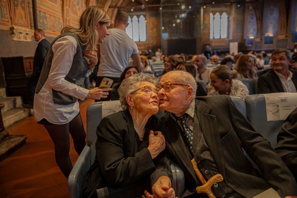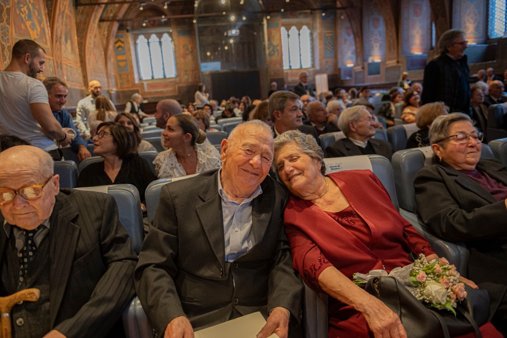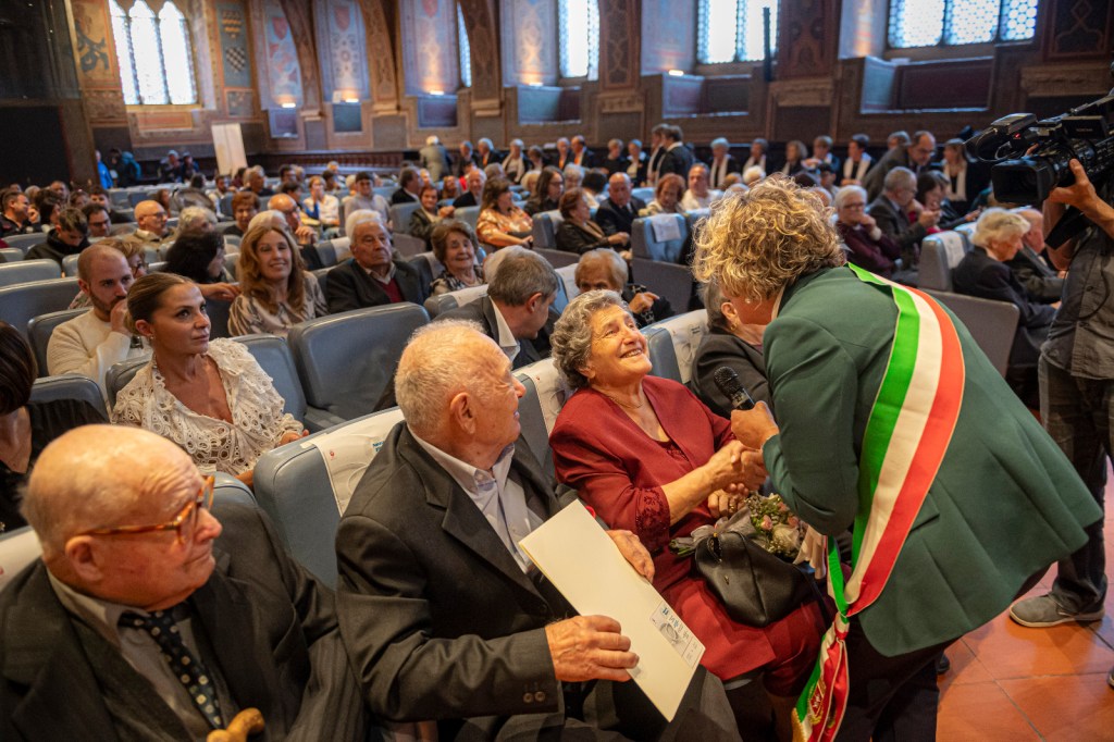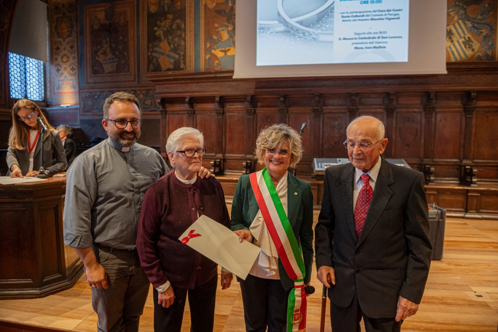 «La città di Perugia – commenta l’assessore Cicchi – ha voluto rendere omaggio e ringraziare 13 coppie di sposi che hanno contribuito, con il loro lavoro, la vita operosa e spesa anche per i figli, allo sviluppo sociale ed economico della nostra città. Un evento servito a ribadire che hanno affrontato la vita con la sua inevitabile alternanza di momenti sia di gioia sia di dolore arrivando comunque a dare una preziosa testimonianza. Gli sposi di lunga data, in una sala dei Notari gremita di figli, nipoti e pronipoti, si sono dichiarati ancora una volta innamorati e pronti a rifare il passo che li ha visto uniti per 65 anni, impegnati l’uno verso l’altro e nei confronti della società. L’augurio dell’amministrazione è che la loro vita sia ancora ricca di soddisfazioni».