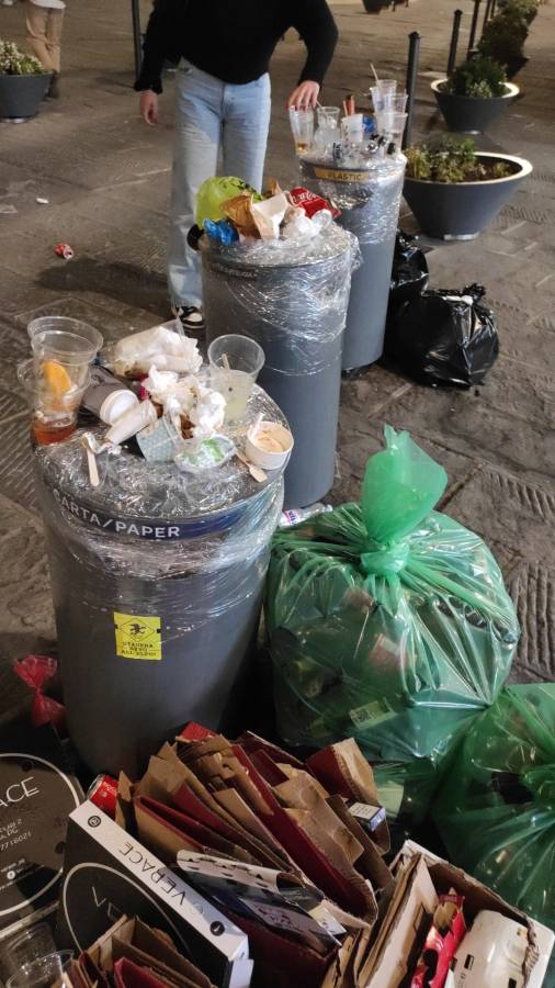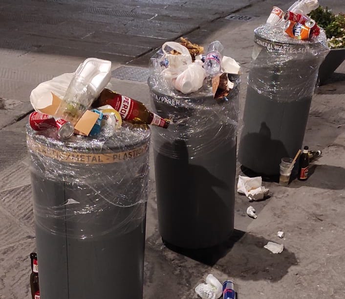 Una questione di sicurezza precauzionale programmata per la visita di ieri del ministro della Giustizia Carlo Nordio per l’innalzamento dei livelli di sicurezza antiterrorismo. Così come, anche, tra le direttive per prevenzione, ci sarebbe quella di saldare i tombini. Tutte pratiche che funzionano ma che, una volta conclusa la visita istituzionale, andrebbero riportate alla normalità Ma così nel capoluogo non è stato fatto e nel giro di poche ore la zona dei cestini dell’immondizia si è trasformata una piccol discarica. Sì, perché viste le belle giornate il centro storico in questi giorni è molto frequentato da perugini e visitatori italiani e stranieri. Gelati, bibite fresche, fazzoletti, pacchetti di sigarettte, qualche birra che però, poi, diventano rifiuti e devono essere eliminati in qualche modo. Chi ha appoggiato bottiglie e coppette di cartone del gelato sopra al nastro trasparente chi, disperato, ha iniziato ad ammucchiare i rifiuti ala base del cestino, intorno ad esso. Insomma, uno spettacolo che proprio non si addice ad una delle piazze più belle dell’Umbria.