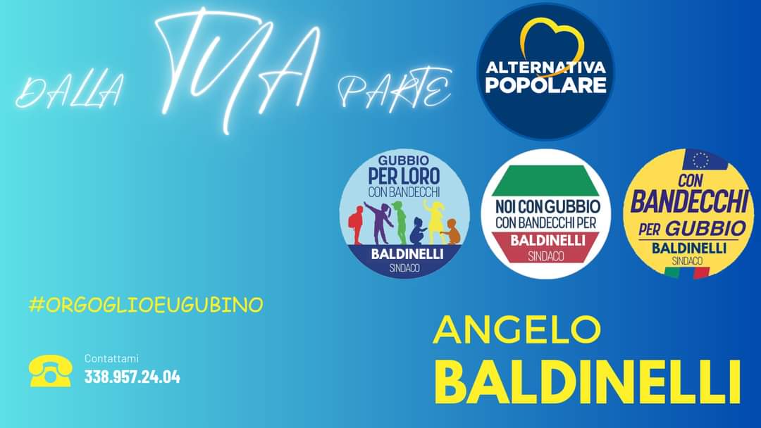 GUBBIO (Perugia) – Il bacio in fronte che ufficializza la candidatura di Angelo Baldinelli per Alternativa Popolare a sindaco della città dei Ceri è arrivato. Nella serata di venerdì 17 novembre, contro qualsiasi timore scaramantico, è stato lo stesso medico, consigliere di minoranza (eletto con la Lega, con un breve passaggio in ItalExit di Gianluigi Paragone, poi a capo della civica Gubbio Nostra) e frontman bandecchiano alla successione di Filippo Mario Stirati, a postare sulla propria pagina Facebook i nomi delle liste che lo sosterranno alle comunali primavera.