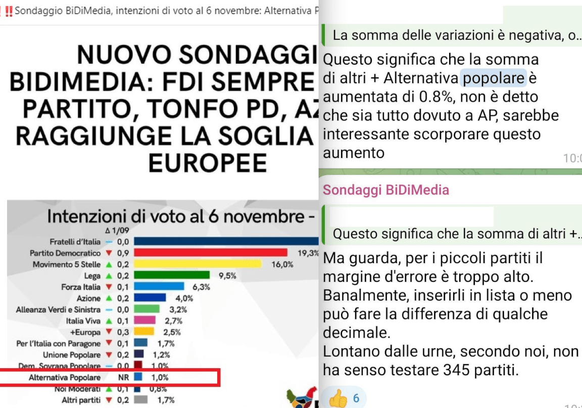 Però nella chat telegram dei commenti di SondaggiBidimedia in molti chiedono cosa sia “Alternativa Popolare” e viene loro spiegato che si tratta del partito di Bandecchi.