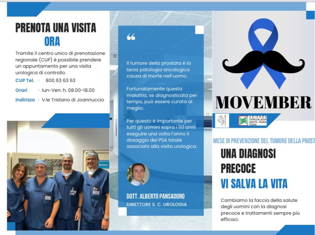 TERNI- Movember a livello internazionale è il mese di prevenzione del tumore della prostata dove una diagnosi precoce salva la vita. «Muoversi e cambiare faccia alla prevenzione, lasciamo crescere i baffi e cambierà il volto alla protezione maschile». Con queste parole il Dott. Alberto Pansadoro sintetizza il cambiamento dell’uomo che a differenza della donna seguita fin dai primi anni dalla ginecologa controlla il suo periodo di crescita mentre l’uomo è più restio e non verifica il proprio stato di salute. Movember nasce negli Stati Uniti e anche in Europa è diventata la giornata della prevenzione, le Usl e le aziende ospedaliere collaborano per l’informazione e per la prevenzione. Dalle ore 9 alle ore 19 presso Largo Villa Glori l’equipe di Urologia dell’ospedale di Terni promuoverà l’iniziativa di sensibilizzazione a tutta la cittadinanza.