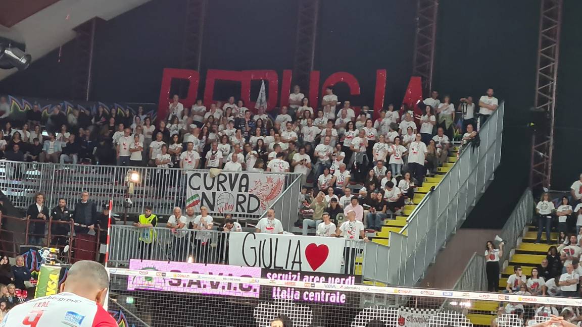 Giulia e un grande cuore rosso: così i tifosi della Curva Nord della Sir, al PalaBarton per la sfida di Perugia contro Piacenza nella sesta giornata di Superlega, ricordano la 22enne, l’83esima vittima di femminicidio in Italia solo dall’inizio dell’anno.