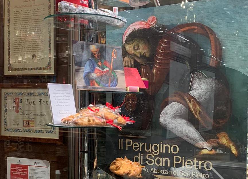 Sant’Ercolano, oltre che protettore spirituale della città, è passato alla storia soprattutto come defensor civitatis, rendendosi protagonista e martire cittadino durante il famoso assedio operato contro Perugia da Totila, re dei Goti. Pertanto il legame tra la città e questo patrono è da sempre molto forte. A testimonianza di questo va assolutamente citata la vetrina del noto locale “Sandri”, vero e proprio pilastro del centro cittadino, che non solo ha celebrato la mostra con vari richiami alle opere esposte, ma ha anche omaggiato Sant’Ercolano, e la scoperta che lo riguarda, con l’ideazione di un dolce dedicato proprio al patrono: le “lasche di Sant’Ercolano”.