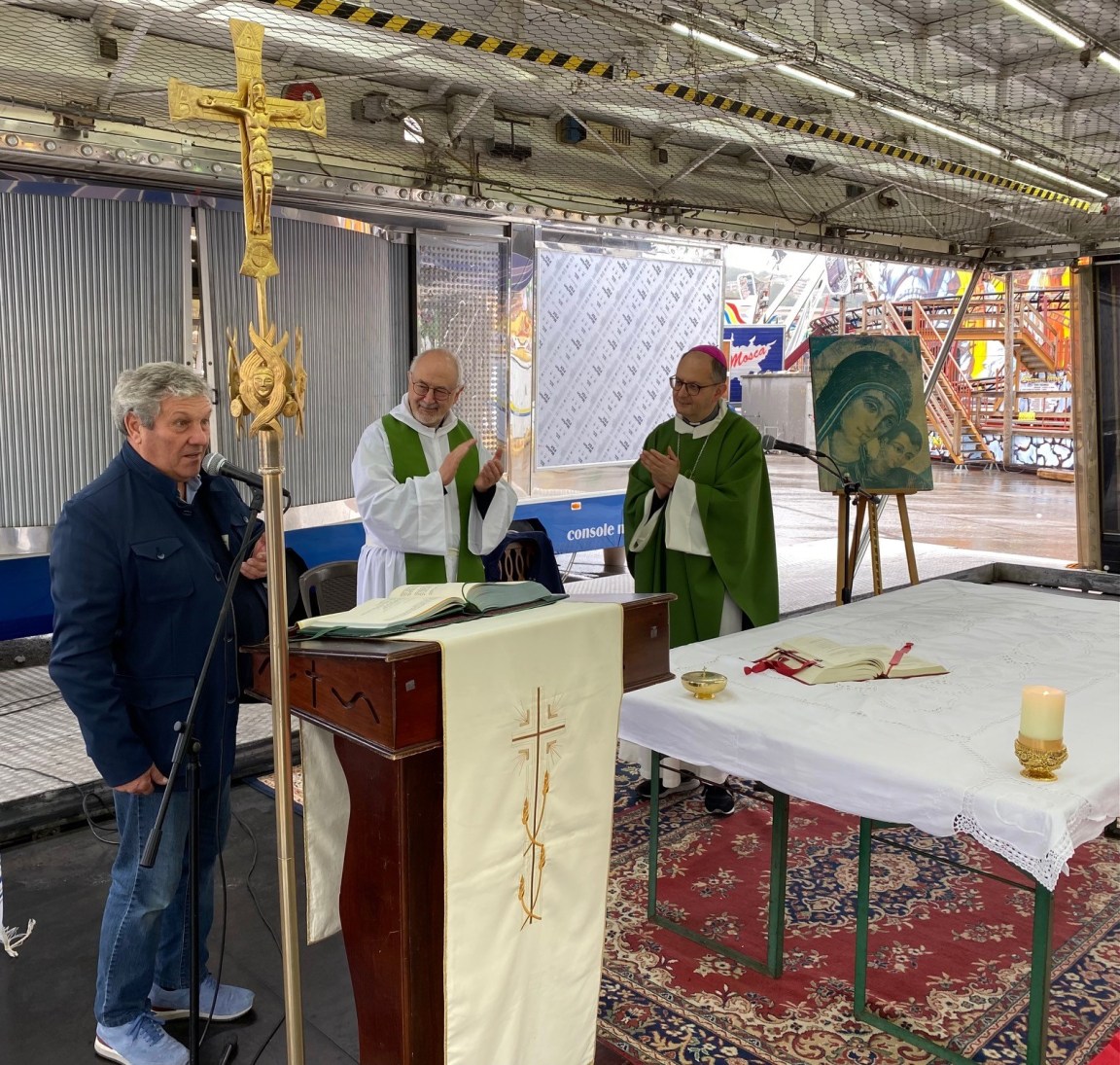 Non poteva mancare la celebrazione eucaristica sulla pista di un autoscontro dedicata a queste famiglie e ai tanti amici perugini conosciuti in un secolo. Monsignor Maffeis ha introdotto la celebrazione rivolgendo a tutti loro un caloroso ringraziamento, che ha detto «vuole essere un abbraccio a tutte le persone di questo mondo viaggiante che con non poche fatiche e preoccupazioni permette con il proprio lavoro a tanta gente di incontrarsi, divertirsi e fare festa insieme. Preghiamo in particolare per quelle famiglie che più di altre sono in sofferenza, chiedendo al Signore di sostenerci nel mettere da parte i nostri egoismi per fare posto nel nostro cuore a quanti si trovano in gravi difficoltà».