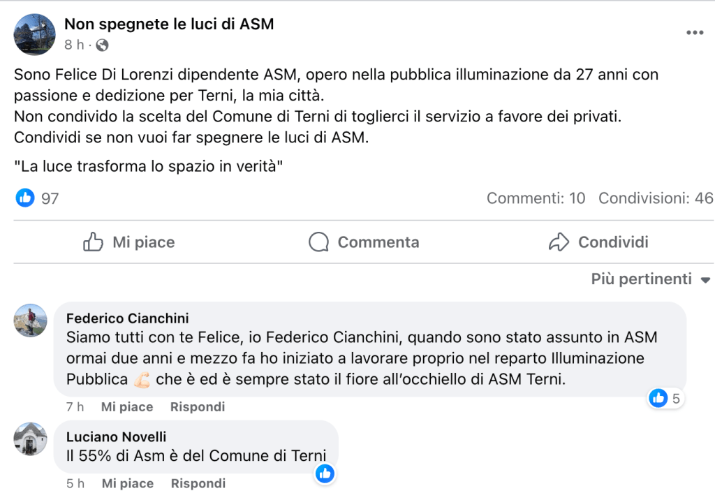 I lavoratori, si tratta di almeno dieci, non ci stanno. Decidono di far sentire la loro voce dando vita ad un profilo Facebook, ma non si escludono, a breve, proteste clamorose. Intanto nella pagina  “Non spegnete le luci di Asm”  c’è chi racconta trent’anni di attività e pasione in un’ azienda che ha in carico la pubblica illuminazione dal 1964.  Felice Di Lorenzi, dipendente Asm da 27 anni, dice pubblicamente: «Non condivido la scelta del Comune di Terni di toglierci il servizio a favore dei privati». I lavoratori, insomma, si  domandano perché,  a fronte di un servizio assicurato per decenni, ora sia giunto il momento di passare la mano ad un privato, nonostante l’illuminazione sia pubblica e nonostante l’Asm sia tutt’ora un’zienda a capitale prevalentemente pubblico, con il Comune di Terni azionista di maggioranza assoluta. Le prossime ore diranno se i lavoratori, seriamente angosciati per il loro futuro, si accontenteranno della protesta virtuale.