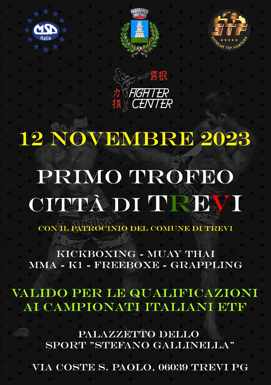 TREVI- Si è svolto il primo Trofeo Città di Trevi, valido per le qualificazioni ai campionati italiani ETF – MSP di Kikboxing, previsti per giugno 2024. Grazie all’impegno della società organizzatrice “Fighetr Center” del presidente Elia Gnozza e del direttore sportivo Marco Trivelli, Trevi ha ospitato oltre 150 partecipanti provenienti da tutta Italia. Atleti di diverse età, appartenenti a venti società di tutto lo stivale che si sono sfidati in varie discipline di arti marziali e di sport da combattimento full contact e light contact: Kickboxing, Muay Thai, MMa, K1, Freeboxe e Grappling. Ospite d’onore della manifestazione è stato l’atleta di casa Matteo Proietti, dodicenne campione italiano di kickboxing 60 kg.