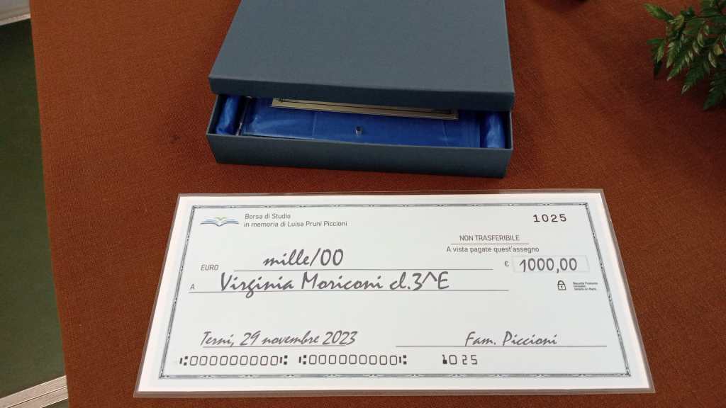 TERNI-Il 29 novembre presso la sede della Scuola L. Da Vinci alle ore 9.30 alla presenza della classe 3E si è svolta la consegna della borsa d studio “Luisa Pruni Piccioni” per l’a.s. 2023/2024 terza edizione. Alla premiazione era presente l’alunna individuata dal Consiglio di classe, quale destinatario del premio, Virginia Moriconi accompagnata da entrambi i genitori e dalla sorella, la famiglia Piccioni con i figli Andrea e Paola, i nipoti Francesco e Alessandro e il Prof. Massimo Piccioni. La giovane premiata, visibilmente emozionata ha ringraziato i genitori e i docenti per il suo percorso di crescita e la famiglia Piccioni per il premio ricevuto. La manifestazione si è aperta con il saluto del Dirigente scolastico. Il prof. Piccioni ha dichiarato, «un grande grazie a nome della nostra famiglia, cara 3^ E di oggi 2022, cara Virginia: a voi i Nostri più vivi complimenti e il nostro grazie per la presenza. Un grazie di vero cuore al Dirigente Scolastico e a tutto il suo staff, a tutte le funzioni istituzionali di questa eccellente scuola, alle persone che ci accompagnano in questa proposta di valorizzare un ricordo ma soprattutto di voler essere uno stimolo per costruire le fondamenta per un futuro: il vostro futuro, cari giovani, in un passaggio di consegne che traduca le cose buone di ciascuno in una proiezione di continuo miglioramento. Un particolare saluto e ringraziamento al mister della Ternana Roberto Breda, oggi presente qui con noi come simbolo dello sport e come rappresentante della Ternana calcio con cui organizziamo il Memorial di calcio Luisa Pruni Piccioni. Sport, lealtà ed impegno come valori della vita e della società. Il primo nostro pensiero è per voi giovani che rappresentate il futuro, siete l’investimento più importante poiché siete portatori delle nostre speranze e le vostre conoscenze, la vostra intelligenza e la vostra cultura sono l’unica garanzia per una collettività che ha necessità di essere sempre più consapevole, solidale e proiettata verso nuovi orizzonti ricchi di valori per una società sempre migliore, in cui il senso del dovere verso se stessi e verso gli altri è il presupposto per valorizzare i propri diritti. Siamo qui oggi per ricordare chi riponeva proprio in voi le speranze di come attraverso l’impegno, lo studio e il rispetto per gli altri era possibile vincere le nuove sfide delle dinamiche sociali, in cui solo la cultura rappresenta la via maestra. Un passaggio di testimone tra generazioni a cui abbiamo pensato in cui il passato spesso aiuta, se fatto di buoni esempi, a stimolare la ricerca continua di crescere, di diventare donne e uomini leader per il bene comune e individuale: obiettivi che si sovrappongono e che si sommano e mai debbono confliggere». Era il 1°ottobre del 1965 quando Massimo e Luisa si conobbero in questa scuola, la 1^E della mitica Leonardo da Vinci frequentata da entrambi i figli Andrea e Paola. Oggi Vittoria, figlia di Andrea, avrà il compito di rappresentare la nostra famiglia. «Innanzitutto la nostra famiglia esprime i più vivi complimenti alla vincitrice di questa borsa di studio e le semplici parole incise sulla targa come motivazione del riconoscimento esprimono la qualità di una ragazza di 14 anni: “ riconoscimento dell’impegno e della lodevole condotta”. A te, Virginia gli auguri per uno splendido futuro ricco di soddisfazioni, anche te costituisci un esempio che è di grande stimolo per chi oggi ti guarda con ammirazione».