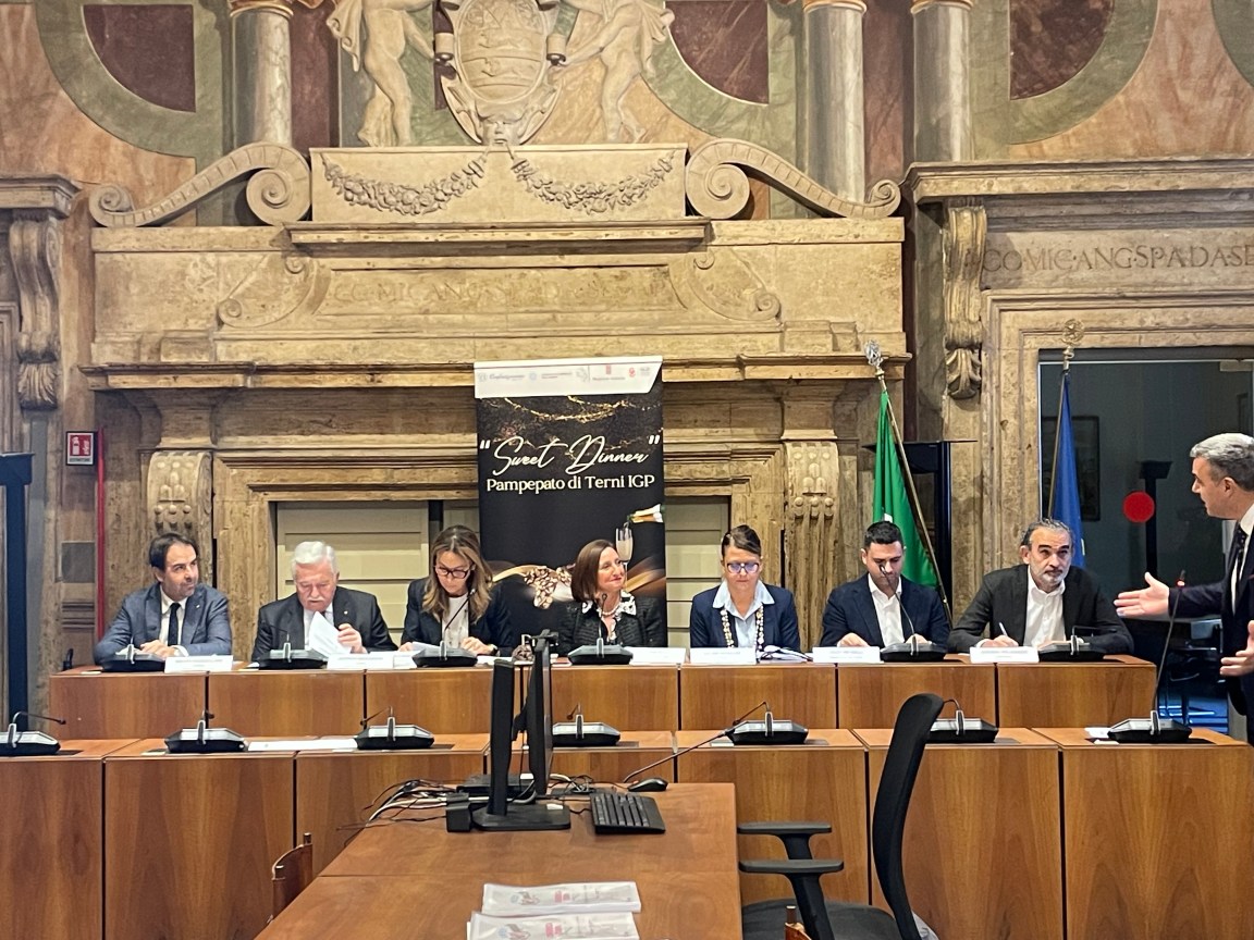TERNI – Il pampepato è diventato ormai uno dei simboli della pasticceria umbra. Non solo nel cuore verde d’Italia ma in tutta la Penisola. Ne è la dimostrazione il recente gemellaggio che ha visto Terni e Cremona celebrare “un dolce matrimonio”. Quello tra il pampepato e il Torrone. Un sodalizio che ha gettato le basi per un evento ancora più grande: creare un festival in cui il pampepato sia il re, in ogni suo aspetto e declinazione, dalla cucina, al teatro, dalla storia alle competizioni. Con l’obiettivo, più ampio, di promuovere, raccontare e festeggiare l’intero territorio ternano. Il tutto concentrato in tre giorni di eventi, dal 22 al 24 novembre, tra le principali vie e piazze ternane. L’iniziativa è stata presentata nella sala consiliare di Palazzo Spada da Paola Agabiti, assessore al bilancio e risorse umane e patrimoniali, turismo e cultura Regione Umbria; Laura Pernazza, presidente della Provincia di Terni; Giorgio Mencaroni, presidente camera di commercio Umbria; Mauro Franceschini, presidente Confartigianato Imprese Terni; Diego Petrelli, rappresentante dei produttori certificati di pampepato Igp; Stefano Pelliciardi, amministratore Sgp Grandi Eventi.