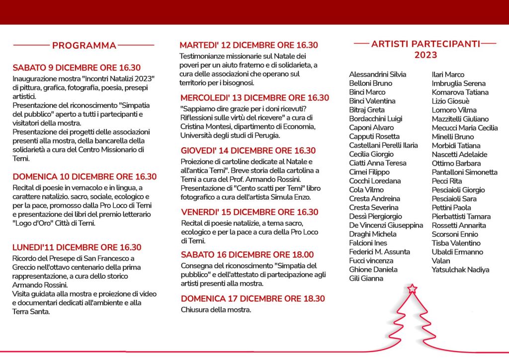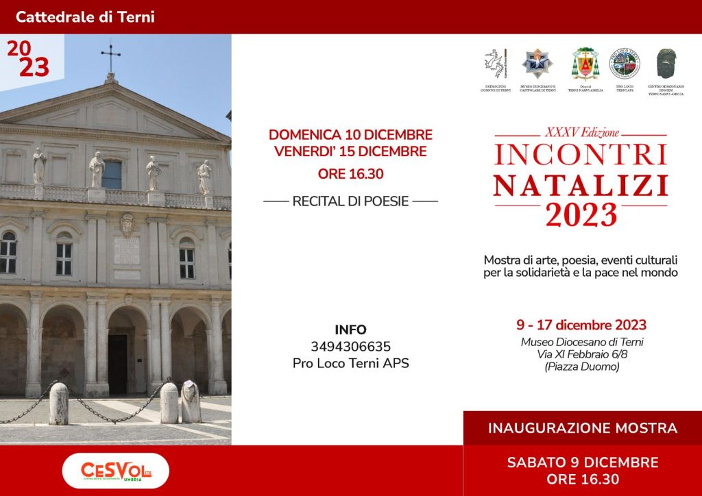Tra gli eventi culturali proposti l’10 e il 15 dicembre si terrà il Recital di poesie in vernacolo e in lingua, a carattere natalizio, sacro, sociale, ecologico e per la pace e presentazione dei libri del premio letterario “Logo d’Oro” Città di Terni. L’11 dicembre la conferenza: “Ricordo del Presepe di San Francesco a Greccio nell’ottavo centenario della prima rappresentazione, a cura dello storico Armando Rossini. Proiezione di video e documentari dedicati all’ambiente e alla Terra Santa.