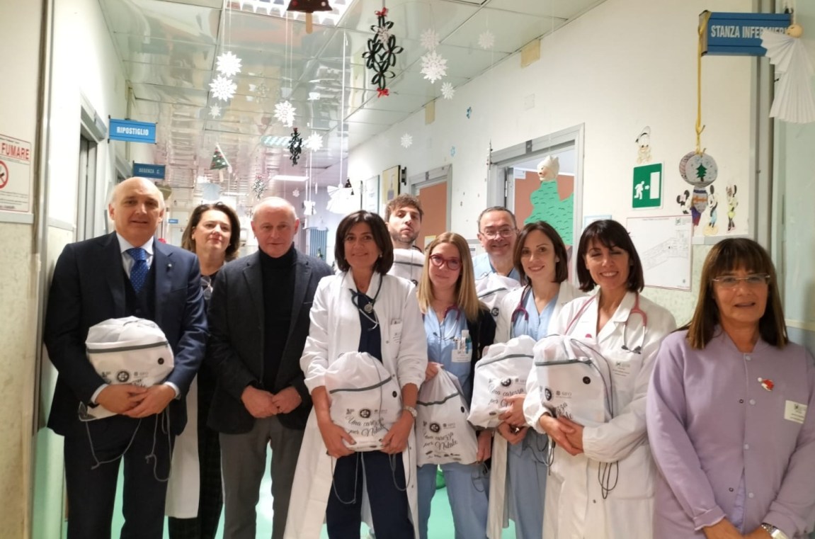 TERNI – I gesti che scaldano il cuore. Soprattutto nel periodo delle festività natalizie verso coloro che purtroppo non si possono godere al meglio e al pieno l’amore e il calore del Natale. Ma grazie alla vicinanza e alla solidarietà di associazioni come quelle dei Cavalieri di Gran Croce anche i bambini del reparto pediatria del Santa Maria Terni possono vivere momenti di serenità e felicità. Una delegazione dell’associazione, rappresentata dal dottor Fausto Bartolini, direttore Farmacia Usl2, ha consegnato alla direttrice di Pediatria Tin, la dottoressa Federica Celi, insieme al direttore generale, il dottor Andrea Casciari e alla dottoressa Monya Costantini, uno zainetto offerto dalla SIFO (Società Italiana di Farmacia Ospedaliera) con all’interno dolcetti e gadget e una lettera scritta direttamente da Papa Francesco in cui augura una felice Natale.