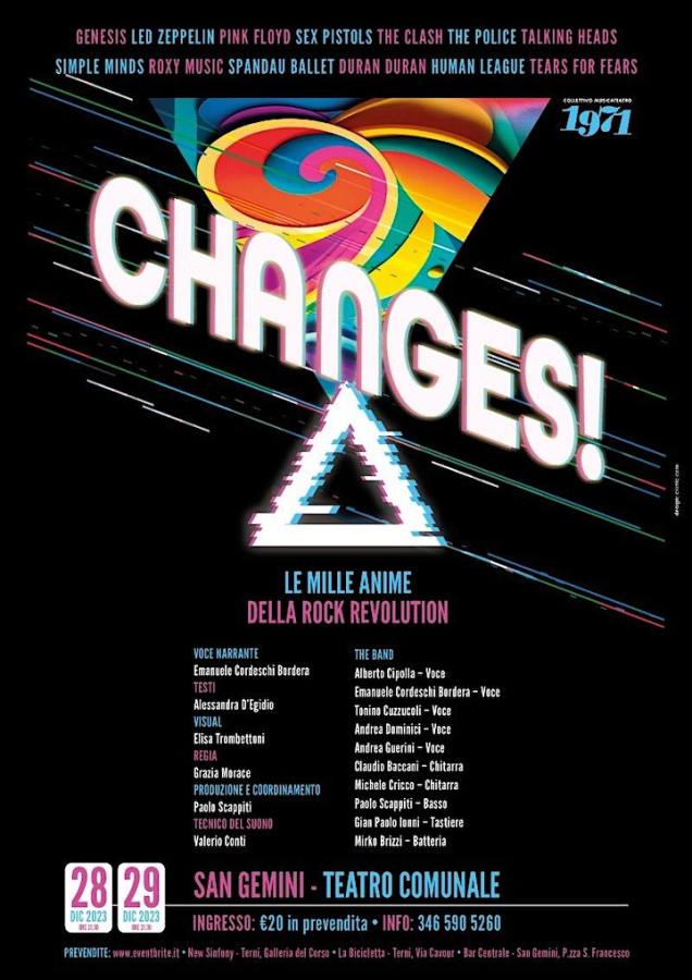 TERNI- Il titolo è Changes, le mille anime della rock revolution ed è lo spettacolo con cui il collettivo Musica Teatro 1971 torna ad esibirsi davanti al suo pubblico. Dopo il successo dello scorso anno dello spettacolo 1971 The rock opera, applaudito da circa 1.500 persone nelle varie repliche in giro per l’Umbria, è ora la volta del capitolo successivo. ‘Changes’ racconta la rivoluzione musicale che animò le scene dagli anni ’70 agli ’80. Saranno suonati i pezzi più noti di quegli anni, dando voce ad un filo narrativo che accompagnerà il pubblico in un viaggio appassionante. Al centro i dieci musicisti ternani: Emanuele Cordeschi voce e attore narrante, Alberto Cipolla voce, Andrea Dominici voce, Andrea Guerini voce, Tonino Cuzzucoli voce, Michele Cricco chitarra, Claudio Baccani chitarra, Paolo Scappiti basso, Gianpaolo Ionni tastiere, Mirko Brizzi batteria e una scaletta musicale che attraversa un ventennio indimenticabile in cui la musica era parte integrante di vari movimenti culturali che cercavano di cambiare il mondo. Per la regia di Grazia Morace e la produzione e coordinamento di Paolo Scappiti, con il patrocinio e la collaborazione del comune di San Gemini, saranno due gli appuntamenti per assistere allo spettacolo: 28 e 29 dicembre nel rinnovato teatro comunale di San Gemini, alle ore 21.30, venerdi 5 gennaio all’auditorium Osma di Marsciano e per il teatro Manini di Narni la data è ancora da definire.
