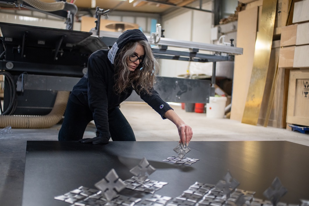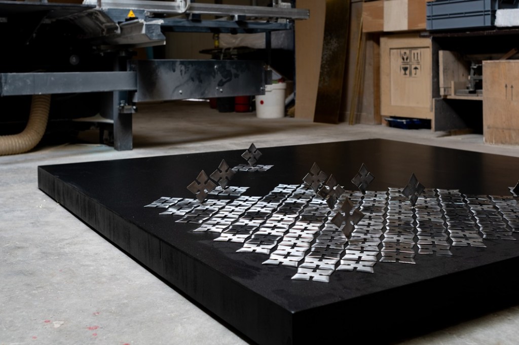In primo piano, tra le opere, una site specific di 4×5 metri, realizzata con 2000 lame di metallo, somigliante a un tappeto di stelle cadenti montate verticalmente, che evoca l’immagine di un esercito: «Il linguaggio visivo crudo e tagliente rispecchia le battaglie che ogni giorno affrontiamo a livello globale. Il commento femminista aggiunge un ulteriore livello di profondità, evidenziando la lotta in corso per l’uguaglianza di genere – le parole del curatore della mostra – In quest’ottica, la creazione di Iv Toshain è uno struggente promemoria del fatto che, anche di fronte alla crudeltà , esiste il potenziale per la bellezza».