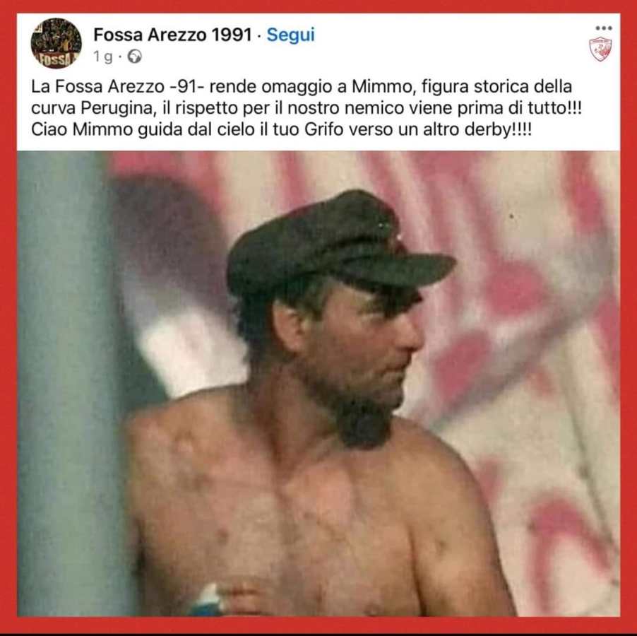 Dopo Marcello Viali, anima dei Freak Brothers della Ternana che a Mimmo augura «Buon viaggio» che segue il post di quando Pucciarini si era improvvisamente aggravato mesi fa, arriva anche il post di Fossa Arezzo 1991. A Perugia, è noto, il vero e più sentito derby da sempre, più che con i rossoverdi è sempre stato quello con gli amaranto dell’Arezzo. Che dai social lo salutano così: «La Fossa Arezzo 91 rende omaggio a Mimmo, figura storica della curva Perugina, il rispetto per il nostro nemico viene prima di tutto!!! Ciao Mimmo guida dal cielo il tuo Grifo verso un altro derby».