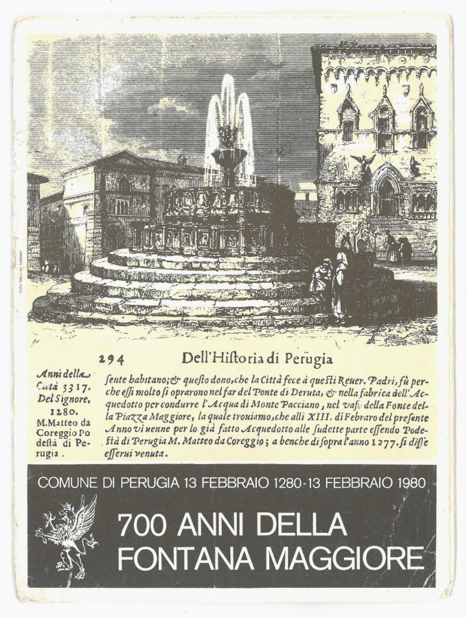 A ricordare l’anniversario è la pagina Facebook Perugia in adesivo che riporta un «cimelio» conservato da una affezionata e tosta 92enne perugina: «Forse lo sanno in pochi, ma oggi è il “compleanno” della Fontana Maggiore. E noi, anche se non è un adesivo, lo festeggiamo proponendovi un’autentica rarità datata 1980, quando si celebrarono i 700 anni dell’opera progettata da Frà Bevignate da Cingoli e realizzata con la collaborazione dell’ingegnere idraulico Boninsegna Veneziano, del fondatore Rosso Padellaio e soprattutto dagli scultori Nicola e Giovanni Pisano, padre e figlio. Si tratta del libretto distribuito dal Comune di Perugia in occasione della cerimonia ufficiale del settecentesimo tenutasi alla Sala dei Notari, quando tra le altre cose si tennero un concerto di musiche medievali e la recita di una lauda perugina del ‘300 con la partecipazione dell’Ottetto vocale da Camera di Perugia diretto dal maestro Salvatore Silivestro e l’interpretazione degli attori del centro artistico “La Turrenetta” diretto da Artemio Giovagnoni: Gino Goti, Fausta Bennati, Roberto Tarini, Rita Dottorini, Fausto Minciarelli, Enrico Battistoni e Francesco Moschini. Nella terza foto troverete anche l’invito (con il programma) dell’allora sindaco Stelio Zaganelli in cui si parla del rifacimento della pavimentazione di piazza IV Novembre. Anche tutto questo è storia meravigliosa della nostra città».