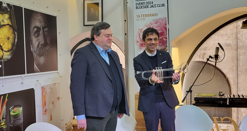 PERUGIA – Presentato a Perugia venerdì 16 febbraio il programma annuale di Blueside Jazz Club, concept store del centro storico che, durante la conferenza, ha voluto omaggiare il sindaco Andrea Romizi, con un particolare oggetto di design raffigurante una tromba realizzata artigianalmente in vetro borosilicato, come simbolo di Perugia capitale del jazz.