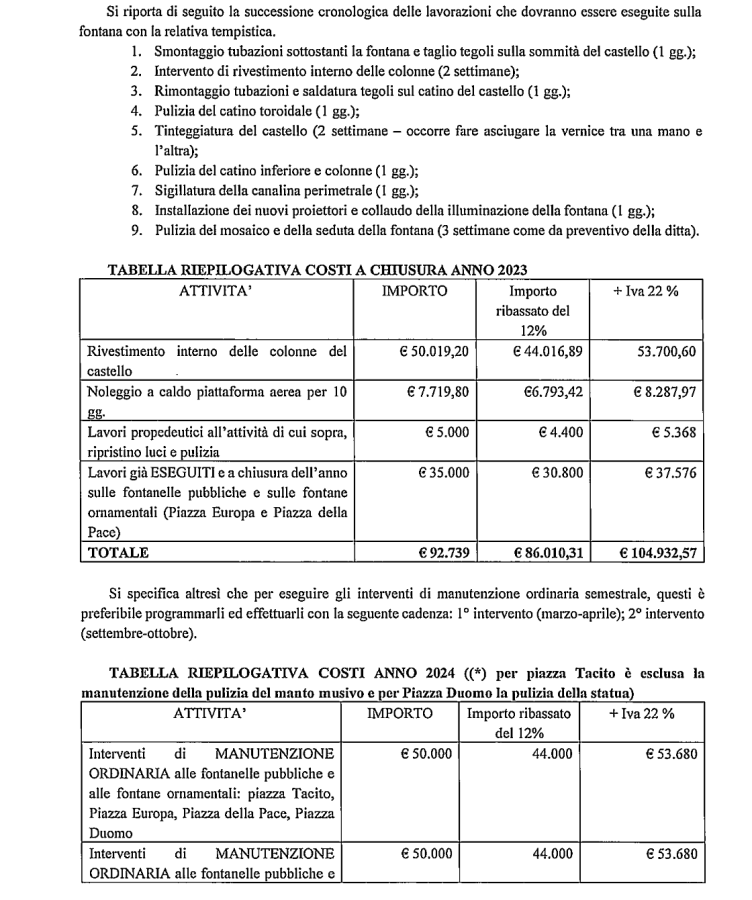 Il documento: «Con riferimento alla richiesta pervenuta con al nota riportata in oggetto (2 agosto, ndr) e ai successivi incontri tenuti presso li Vs Ufficio, si rappresenta quanto segue. Relativamente alla protezione interna delle colonne, questa Azienda ha preso contatto con l’impresa Mdl Risanamenti che si è resa disponibile ad eseguire l’intervento di rivestimento della superfice interna delle colonne del castello della fontana in oggetto. In data 07 settembre l’impresa Mdl Rivestimenti ha eseguito una ispezione visiva all’interno delle colonne, tesa a verificare al fattibilità dell’intervento. La stessa ni data 13 settembre ha rimesso relazione con preventivo. Nella relazione ha fatto presente che l’intervento può essere eseguito inserendo le cosiddette “calze” dal basso delle colonne quindi lavorando dal locale tecnico della fontana. L’impresa ha fatto altresì presente che sarà necessario tagliare i tegoli disposti alle estremità superiore delle colonne per permettere al fuoriuscita della calza».