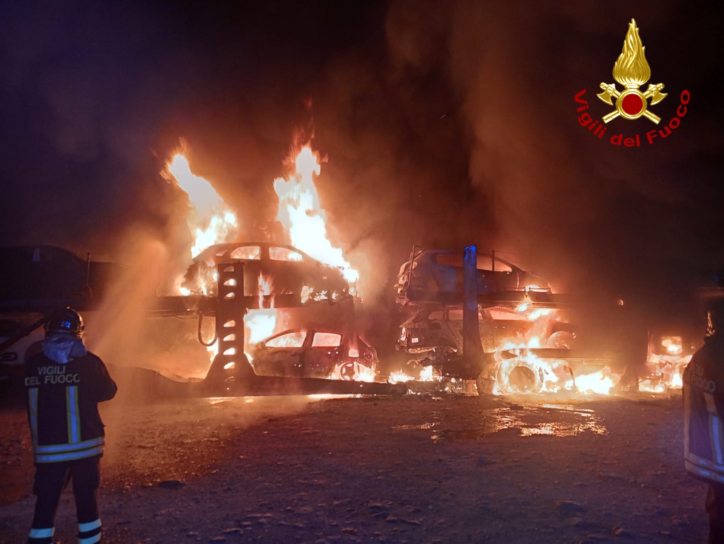 ORVIETO (Terni) – Ci sono volute ore per domare le fiamme che hanno avvolto un autoarticolato fermo in un’area per la sosta notturna nelle vicinanze del casello di Fabro. E la squadra del distaccamento di Orvieto dei vigili del fuoco, alle 8 di venerdì 16 febbraio, sta ancora intervenendo per effettuare le operazioni di bonifica. Erano le 4,40 quando i vigili sono arrivati sul posto: l’incendio aveva già interessato sia l’ autoarticolato bisarca sia le 7 autovetture che trasportava. La ricostruzione: il mezzo era fermo con il conducente all’interno intento a riposare quando l ‘autista, un campano del 1969, ha avvertito del fumo in cabina di guida e scorgendo delle fiamme. Si è subito adoperato per lo spegnimento ma le sue azioni si sono verificate vane. Le operazioni sono state complesse in quanto le fiamme all’arrivo dei vigili già avevano avvolto le autovetture trasportate. Ingenti i danni. Sono andati completamenti distrutti il mezzo e 5 delle 7 autovetture. Il conducente ha riportato, durate le fasi di spegnimento alcune ustioni alle mani ed una intossicazione da fumo e pertanto è stato affidato alle cure del personale sanitario intervenuto.