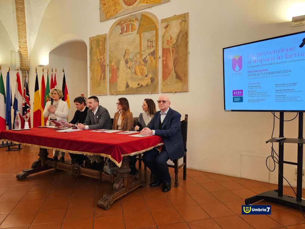 La presentazione del programma nella sala della Vaccara di palazzo dei Priori di Perugia giovedì 15 febbraio alla pressenza del sindaco Andrea Romizi e dell’sssessore alle Politiche sociali del Comune di Perugia Edi Cicchi, di Lucia Sada (membro del cda Afas), del direttore generale dell’azienda speciale farmacie comunali Raimondo Cerquiglini, del presidente L’Aura Alessio Bevilacqua e della senologa Silvia Aiuti, presente con il suo staff, la dottoressa Lorenza Carnevale e il dottor Gianluca Romeo.