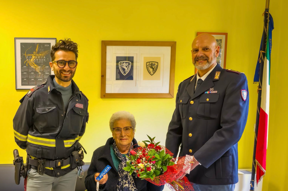 «Un grazie, detto con un mazzo di fiori e con un portachiavi della Polizia di Stato che servirà a ricordarle di togliere le chiavi dalla serratura ogni volta che chiuderà la porta di casa dietro di sé. Abitudine che spesso gli anziani, trascurano specie nei piccoli centri abitati. Con questo gesto la Polizia Stradale di Orvieto ha voluto ringraziare la signora Anna, una pensionata 80enne di Fabro, che con la sua prontezza d’animo e con la sua dinamica intelligenza, senza saperlo, ha permesso di arrestare una 35enne ricercata dalle Forze dell’Ordine per numerosi reati contro il patrimonio con a carico ordini di carcerazione per un minimo di 25 anni di carcere.