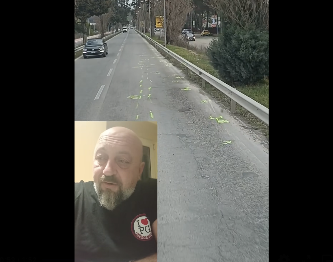 Il Perugino mostra i rilievi effettuati dalle forze dell’ordine, ma copre con un cuore rosso la sagoma del corpo del motociclista 53enne e lancia un appello alle istituzioni: «Vi prego, levate quella sagoma, fatelo per gli amici e i parenti della vittima che ogni giorno passano da qui», il senso delle sue parole commosse.
