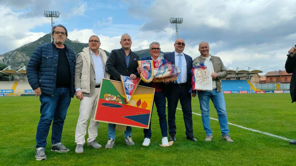 GUBBIO (Perugia) –Un quadro al posto del tradizionale gagliardetto societario prima del calcio di inizio. Lo ha consegnato oggi il patron della Pietralunghese, il re del tartufo Giuliano Martinelli, qualche istante prima della finalissima di Coppa Italia di Promozione con il Cannara in programma allo stadio Barbetti di Gubbio. Così sport e fair play si fondo con arte, amicizia e tutela delle eccellenze agro-alimentari.