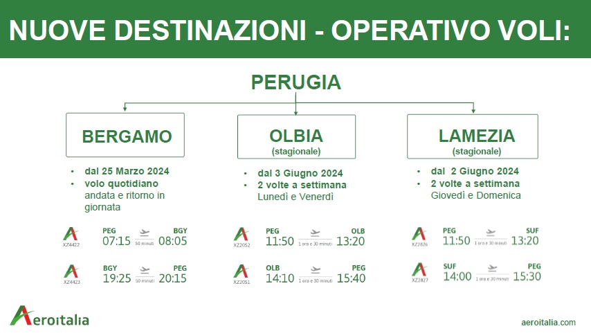 In un incontro, che ha visto la partecipazione della presidente della Regione, Donatella Tesei, dell’assessore regionale ai Trasporti, Enrico Melasecche, del presidente della Sase, Antonello Marcucci e del ceo di Aeroitalia, Gaetano Intrieri, è stato annunciato che il già previsto volo quotidiano Perugia-Bergamo, nelle giornate di sabato e domenica farà rotta per l’aeroporto di Linate, anziché Orio al Serio, rendendo così un duplice servizio ai passeggeri che partono dall’Umbria. Saranno invece bisettimanali i voli per Lamezia Terme e Olbia.