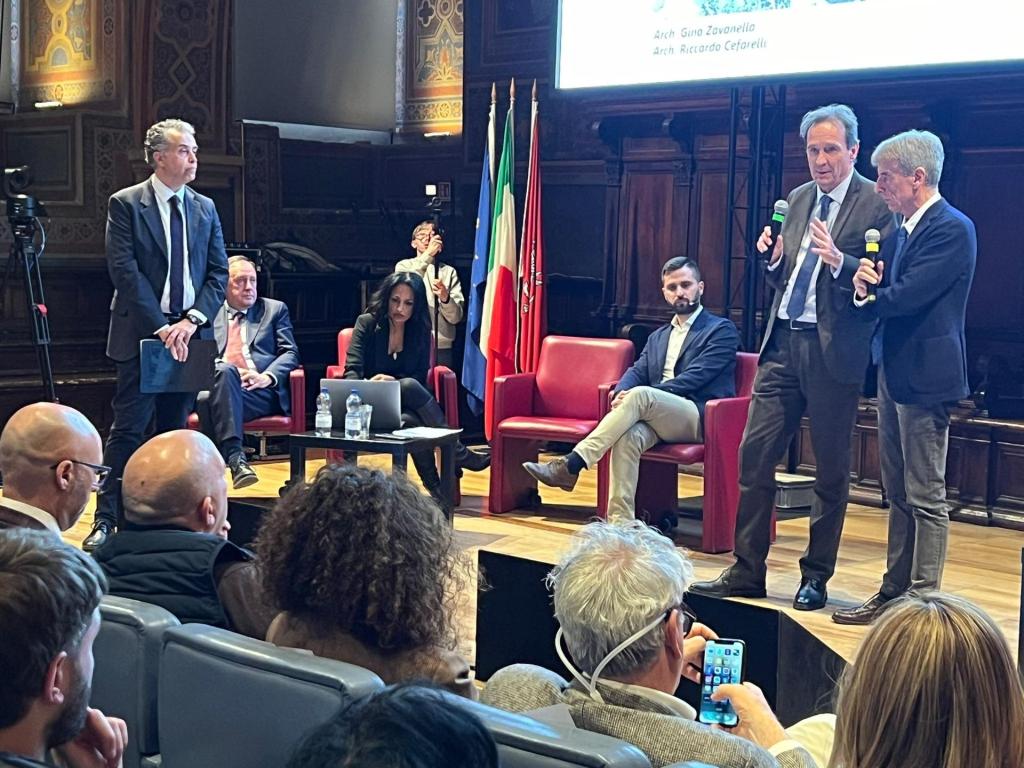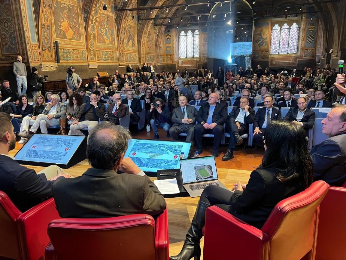 PERUGIA – Ecco il nuovo Renato Curi: presentato alla città, alla Sala dei Notari, il progetto per la realizzazione del nuovo stadio di Perugia proposto all’amministrazione comunale dalla società Arenacuri srl.