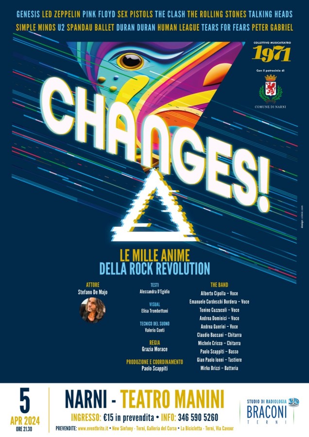 NARNI- Dopo il successo dello scorso anno dello spettacolo 1971 The rock opera, applaudito da circa 1500 persone nelle varie repliche in giro per l’Umbria, torna ad esibirsi davanti al suo pubblico il collettivo Musica Teatro 1971. Arriva il capitolo successivo Changes che racconta la rivoluzione musicale che animò le scene dalla fine degli anni ’70 ai primi anni ’80. Il 5 aprile alle ore 21.30 al teatro Manini saranno suonati i pezzi più noti di quegli anni, dando voce ad un filo narrativo con cui l’attore Stefano De Majo accompagnerà il pubblico in un viaggio appassionante insieme ad una rappresentazione visual /graphic novel creata intorno alla storia. I dieci musicisti ternani sono Emanuele Cordeschi voce, Alberto Cipolla voce, Andrea Dominici voce, Andrea Guerini voce, Tonino Cuzzucoli voce, Michele Cricco chitarra, Claudio Baccani chitarra, Paolo Scappiti basso, Gianpaolo Ionni tastiere e Mirko Brizzi batteria. La scaletta musicale attraversa un ventennio indimenticabile in cui la musica era parte integrante di vari movimenti culturali che cercavano di cambiare il mondo. La regia è di Grazia Morace e la produzione e il coordinamento è di Paolo Scappiti.