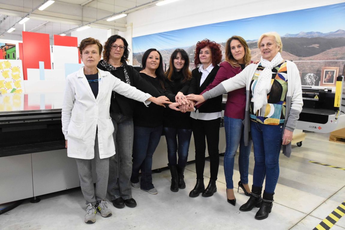 Da quel momento Tatiana è subentrata al posto dello zio, in un ruolo non certo facile, e Rita le è rimasta accanto da supporto e spalla fondamentale per la gestione e organizzazione aziendale. Poi è arrivato il Covid, la pandemia che ha sconvolto tutti e rischiato di mettere a tacere entusiasmo e speranza. «E’ stata dura, anzi durissima – prosegue con la voce rotta dall’emozione, la titolare dell’azienda, affiancata dalle colleghe – ma anche questa volta non ci siamo arrese, e come sempre insieme, con il sorriso e la voglia di non mollare stiamo uscendo anche da questo periodo. Oggi nel nostro piccolo siamo ancora una realtà che può dire la sua nel settore della prestampa e stampa digitale: lo dimostra il fatto che abbiamo investito su un nuovo macchinario da taglio, per chiudere il cerchio del reparto produttivo».
