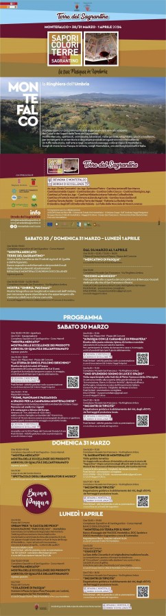 Il programma, ricchissimo e consultabile nel dettaglio sul sito web http://www.stradadelsagrantino.it nella sezione eventi, prevede: laboratori di cucina per adulti e bambini al teatro San Filippo Neri (dalla ricetta dei pulcini salati di Pasqua a quella della pasta colorata ripiena di ricotta e nocciole); passeggiate e trekking con guide escursionistiche, tra i vigneti e le campagne a ridosso del borgo; degustazioni gratuite di vini e oli evo di produzione locale, anche in abbinamento ad altri prodotti della gastronomia locale; spettacoli di sbandieratori e musici; visite esperienziale sulla Natività di Pietro Vannucci detto il Perugino; visite guidate tematiche attraverso la storia del vitigno autoctono del Sagrantino; urban trek ‘A caccia dei pesci’, camminata ‘burlona’ alla scoperta di vicoli, vie, piazze e luoghi d’arte dentro e fuori le mura del borgo di Montefalco e inaugurazione del Parco del Sol. Da segnalare, lunedì di Pasquetta dalle 12 alle 19, nel Complesso espositivo di Sant’Agostino, il banco degustazione del Consorzio Tutela Vini Montefalco ‘Montefalco terra per il vino’, durante il quale, al costo di 10 euro, si potranno assaggiare liberamente vini DOC Montefalco, DOC Spoleto e DOCG Montefalco Sagrantino a cura di sommelier. Infine, immancabile, la colazione di Pasqua, domenica mattina in piazza, con la tipica pizza pasquale con salumi, accompagnata dai vini Montefalco, e la tradizionale Gara della Ciuccetta nel pomeriggio.