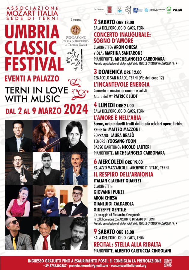TERNI – “Terni in love with music” è il titolo della seconda edizione dell’Umbria Classic Festival che ritorna ad animare e far battere il cuore dei palazzi ternani, ma anche dei cittadini, dal 2 al 9 marzo con un ricco calendario di appuntamenti. La rassegna è organizzata dall’Associazione Mozart Italia Terni di Anais Lee con il sostegno della Fondazione Carit e la collaborazione del Comune di Terni. Su il sipario al Caos con il “Sogno d’amore” del primo clarinetto dell’orchestra del Teatro alla Scala di Milano, Aron Chiesa; la violista del quartetto Werther, Martina Santarone e il pianista di fama internazionale, Michelangelo Carbonara. Palazzi storici come palazzo Mazzancolli, sede dell’Archivio di Stato, la Sala dell’Orologio al Caos, il Cenacolo San Marco di Terni saranno gli scenari e le quinte perfette per eventi di tale taglio culturale.