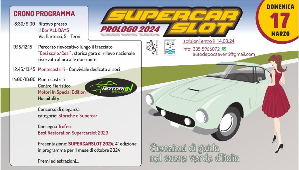 TERNI – “Supercarslot” scalda i motori. La manifestazione di rilievo nazionale ideata da “Autodepocaeventi” che accompagna in Umbria gli appassionati del motorismo storico e delle supercar, torna con la sua sfilata di veicoli storici e da competizione, domenica 17 marzo.