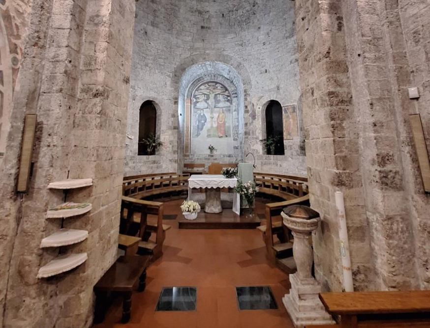 La pianta dell’edificio è estremamente peculiare: una singola navata ripartita in due campate sulla quale si innesta un alto corpo cilindrico con copertura a cupola e terminata da un’abside quadrangolare. Le tre parti architettoniche sembrano presentare caratteristiche eterogenee, per cui la loro datazione e dunque la loro coeva realizzazione è controversa. Fu poi il famoso storico Luigi Lanzi che nelle indagini archeologiche, da lui guidate, nel 1909, accerto l’esistenza di una domus romana al di sotto della Chiesa stessa. Domus databile a partire dal I sec. a.C.. Spazi abitualmente non accessibili, ma che il FAI mette a disposizione dei visitatori, in queste giornate speciali. All’interno, sul fianco sinistro della navata, si trova la cappella Manassei decorata con un ciclo di affreschi del trecento. Alcune ricostruzioni storiche, non sempre adeguatamente verificate, riconducono la vita del luogo a fatti im- portanti e quasi leggendari, ma qui saranno i nostri narratori a svelarne i segreti ed i giusti accenti.