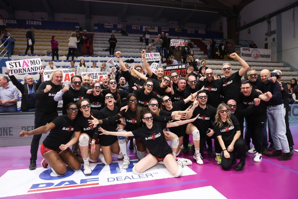 PERUGIA – La Bartoccini Fortinfissi Perugia torna in serie A1 dopo un solo anno di “purgatorio”. Cade l’ultimo pallone al Pala Radi, è un 3 a 0 senza storia in favore delle Black Angels che non lasciano scampo alle padrone di casa della Cremonaufficio Esperia Cremona e centrano con due giornate di anticipo la promozione in massima serie. Il sogno del ritorno in A1, partito a metà agosto con la preparazione, è finalmente coronato nel migliore dei modi.