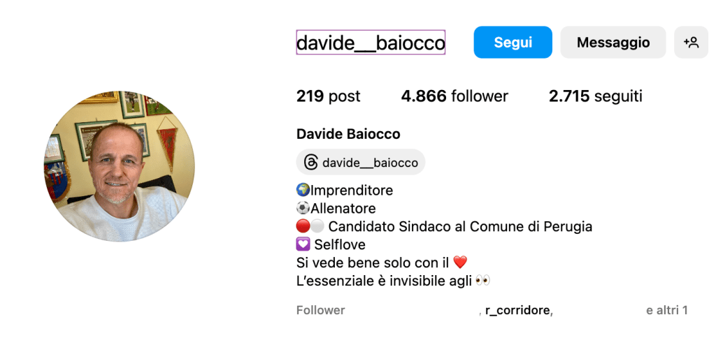 Augura le «migliori fortune» ad Alternativa popolare ma mister Baiocco va avanti con il progetto, supportato dalle due liste civiche a suo sostegno. Un video a cuore aperto su Instagram (sotto la versione integrale) che funge da «comunicazione ufficiale», in cui Baiocco mette la faccia con grande determinazione e coraggio. Con la sua immagine di copertina su Facebook subito cambiata, rispetto a quella che campeggiava fino a domenica mattina, con un’immagine di lui in campo con la maglia del Perugia contro Roberto Baggio.