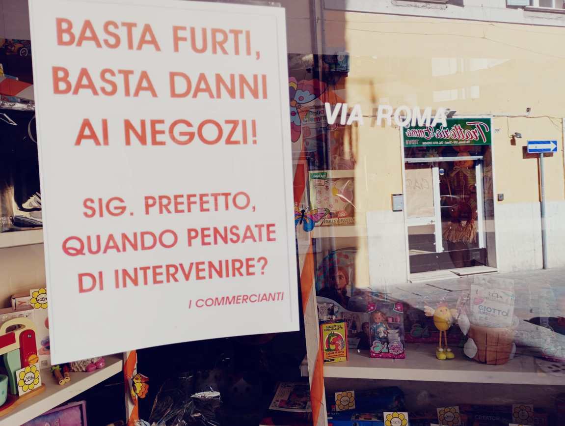 TERNI – Spaccate, aggressioni, risse, scippi, furti. Un vero e proprio attacco al cuore di Terni. I commercianti del centro, all’indomani della spaccata al negozio di scarpe Massarelli in largo dei Banderari, si sono uniti in un’ iniziativa di protesta contro l’ escalation di furti ai danni delle attività economiche. Corso Vecchio, via del Tribunale, via Roma, via Garibaldi sono solo alcune delle vie dove sono comparsi cartelli con la scritta “Basta furti, basta danni ai negozi! Signor prefetto quando pensate di intervenire?”. Locandine uguali per tutte le vetrine. «E’ il nostro grido d’allarme. E’ un appello al prefetto di Terni» .
