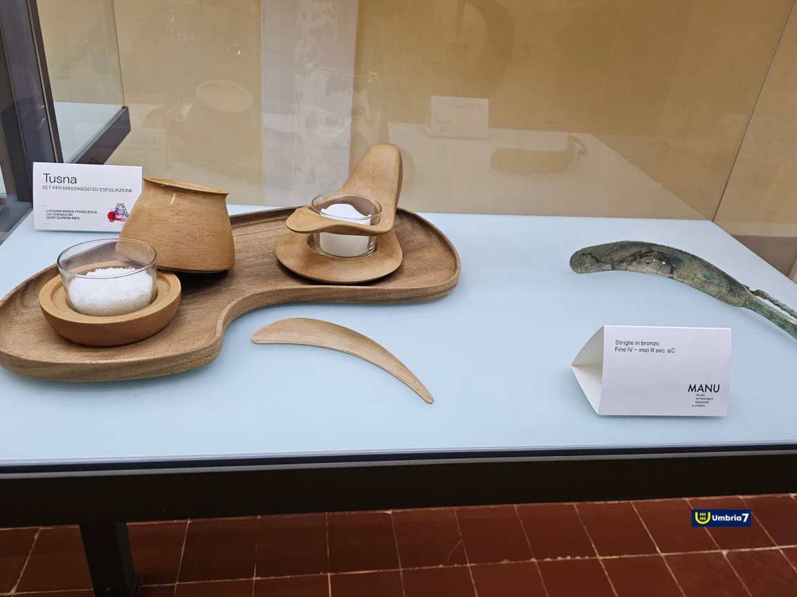 Nello specifico, partendo dai reperti archeologici ospitati nel museo di piazza Giordano Bruno, i giovani allievi dell’Aba hanno realizzato una collezione ispirata ad antichi arredi e oggetti utilizzati dagli Etruschi per la cura del corpo, riproponendoli in stile contemporaneo, con materiali naturali, e rendendoli in gran parte strumenti o accessori ecosostenibili. In tutto una ventina di opere.