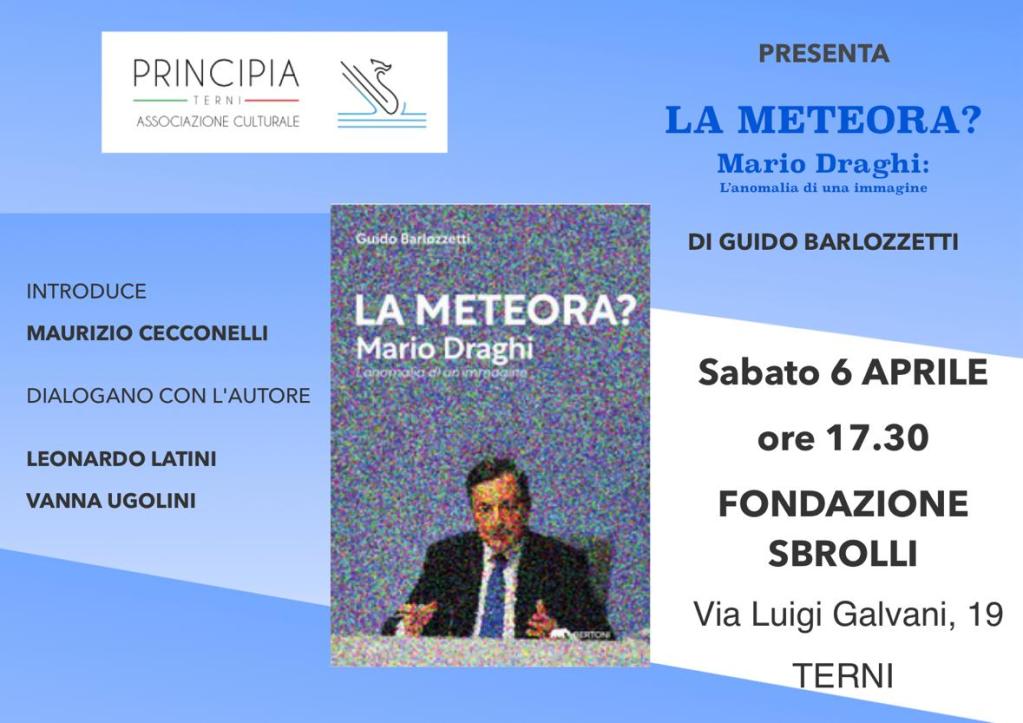 TERNI – “La meteora? Mario Draghi: l’anomia di una immagine” è il volume che presenterà l’autore Guido Barlozzetti il 6 aprile alle ore 17.30 presso la Fondazione Sbrolli. A dialogare con l’autore saranno l’ex primo cittadino di Terni, Leonardo Latini e la giornalista, Vanna Ugolini. L’introduzione è affidata al membro dell’associazione Principia, Maurizio Cecconelli.